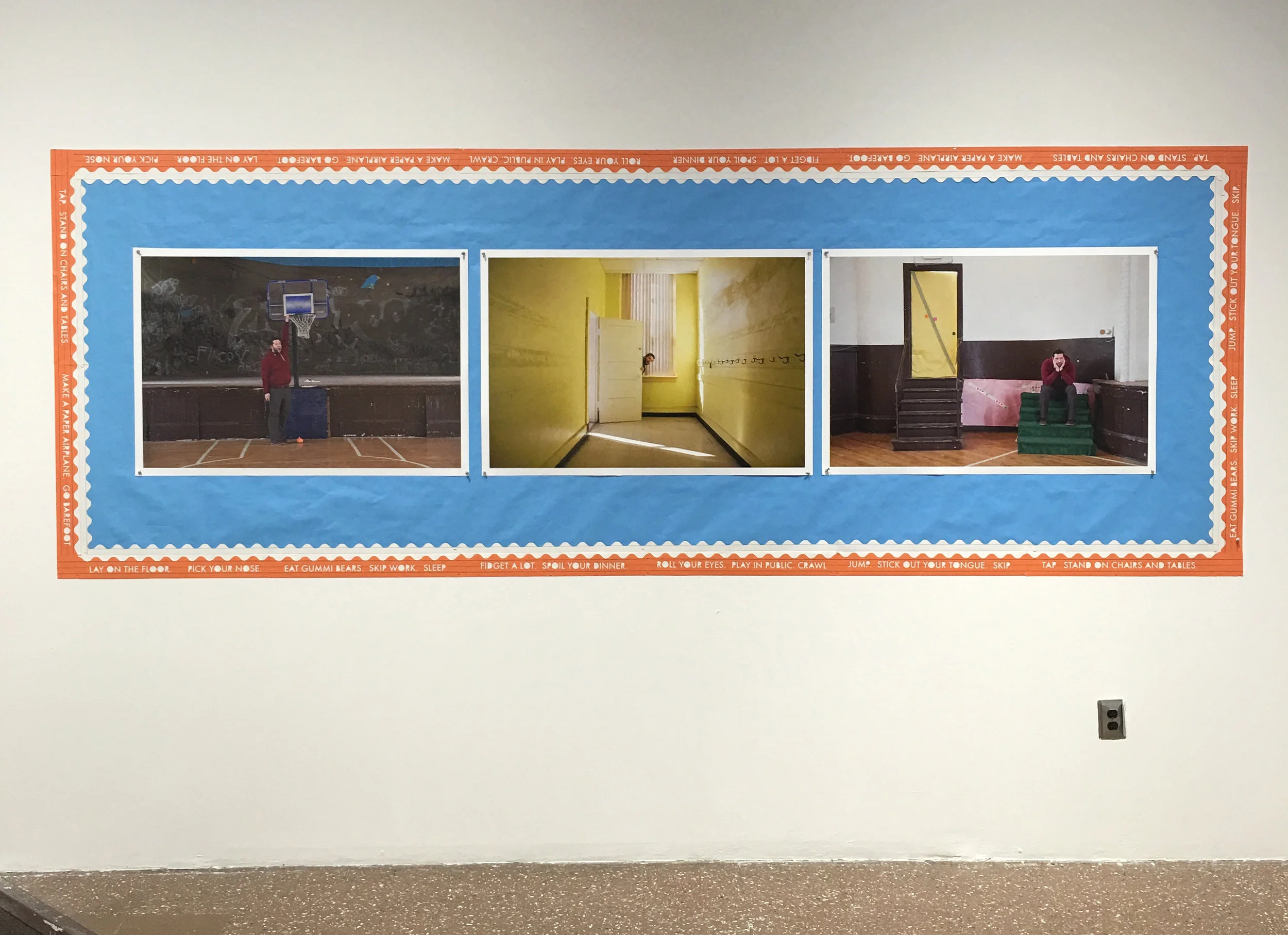 Installation view with laser cut How To Be A Large Child border.